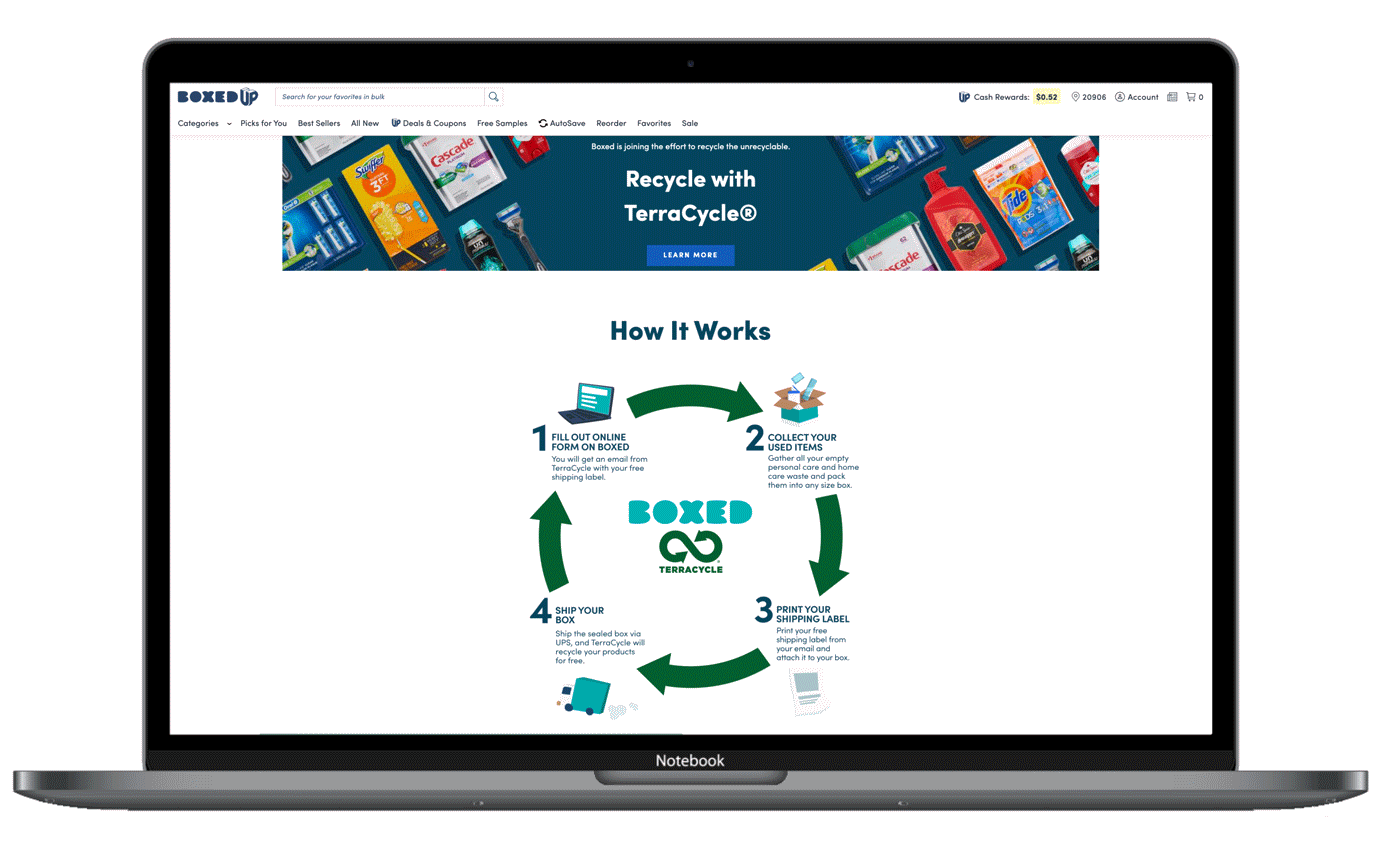 Boxed partnered with TerraCycle® to implement a recycling program that allowed customers to recycle items they did not know were recyclable or hard to recycle in general.